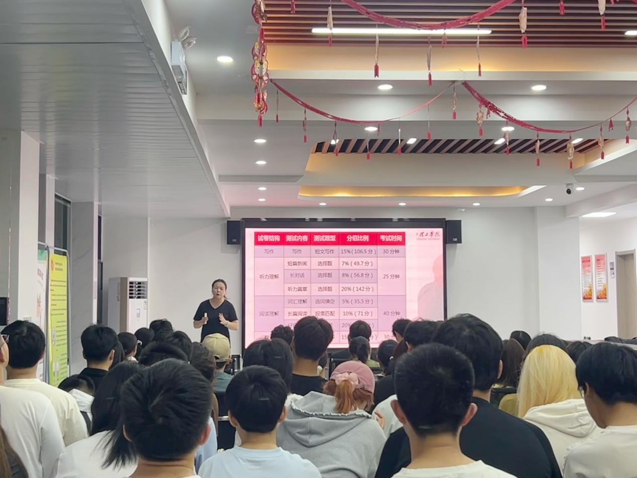 主讲教师袁媛围绕大学英语四级考试大纲,全面解析了听力、阅读、写作和翻译四大题型的特征与分值权重,通过现场演示“关键词定位法”,帮助学生快速准确地在长篇匹配题中找到答案。她还详细讲解了最新评分标准和答题时间分配技巧,帮助学生明确备考优先级。针对60天备考周期,袁媛老师为学生量身定制了高效复习计划,涵盖每天的学习任务和每周的复习重点,并重点推荐了听力冲刺提分指南。她强调,阶梯式复习策略能够帮助学生循序渐进地提升能力,避免盲目备考。