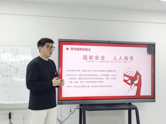 4月中旬,学院组织各班级召开 “青年挺膺担当,共铸国安之盾” 主题班会。班委从国家安全的基本概念、全民国家安全教育日的设立背景等内容切入,着重阐释总体国家安全观涵盖的政治安全、国土安全、军事安全、经济安全、文化安全、社会安全、科技安全、网络安全、生态安全、资源安全、核安全、海外利益安全、生物安全、太空安全、极地安全、深海安全等多个领域内容。学生党支部组织学生党员进求实“一站式”学生社区开展《总体国家安全观》、《保密法》等主题宣讲。