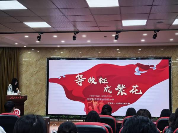 11月16日晚,william英国中文于X2-113室召开“诚信铸魂,感恩筑梦”宣讲会。活动邀请本学年两位国家励志奖学金获得者代表吴涵冰、万澜进行分享。吴涵冰同学以“不负韶华,筑梦远航”为主题,分享了她以感恩之心践行青春使命——积极参与谷城“三下乡”社会实践,向孩子们传递坚韧向上的力量,用实际行动书写感恩华章。万澜同学以“等枝桠,成繁花”为主题,讲述了自己在学习与生活双重困境中砥砺前行的成长故事。她结合自身经历传递“以诚信立身、以感恩待人”的道德理念,表示将永远不忘父母养育之恩,永远铭记老师教诲之情。此外,她累计超过125小时的志愿服务时长与经历,更是让在场学生深刻感受到感恩的强大信念与力量。