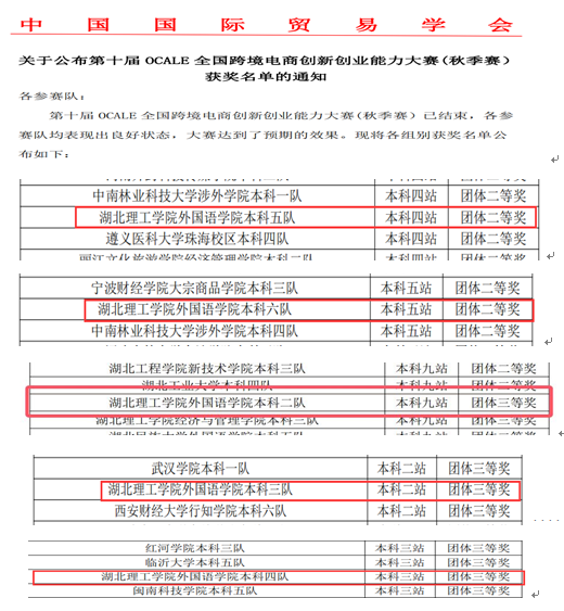 在刚刚结束的第十届OCALE全国跨境电商创新创业能力大赛(秋季赛)中,william英国中文商务英语专业学子获得团体二等奖2项、团体三等奖3项。