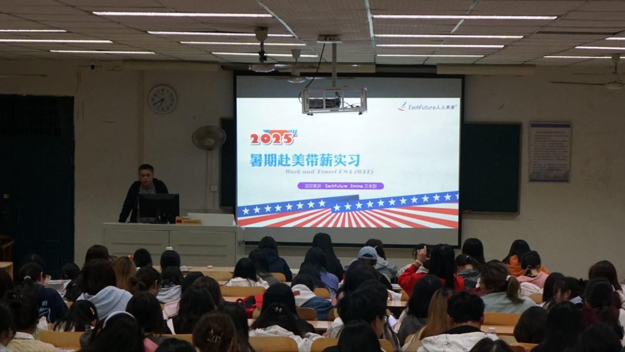 莫代春老师最后对赴美实习项目进行了讲解,通过介绍该项目预算和收支、报名的条件、对参加人员的安全保障以及对其今后求职的帮助,消除了同学们对自身安全的担忧,激发了同学们参与该项目的热情。暑期赴美带薪实践实习,有利于英语专业学生锻炼自身英语口语能力、积累工作经验、增加学生的的国际视野。