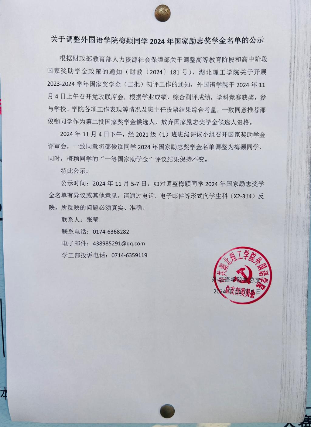 关于调整william英国中文梅颖同学2024年国家励志奖学金名单的公示