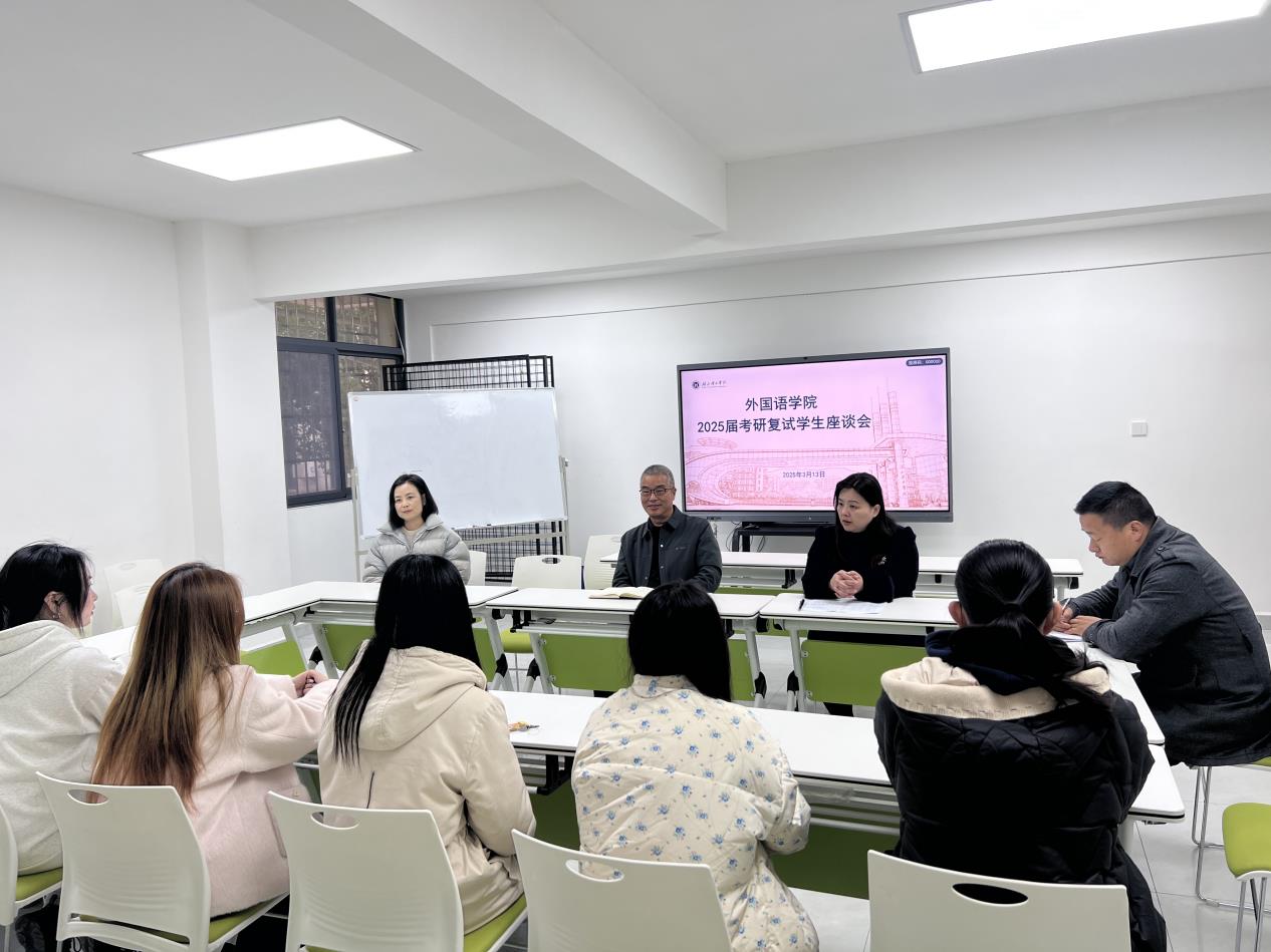座谈会上,学院党总支书记占赢首先对初试中取得优异成绩的学生表示祝贺,并强调“复试是考研的‘临门一脚’,既是专业能力的检验,更是综合素质的展现”。他激励同学们合理规划时间,了解报考院校复试形式,关注研招网最新信息动态,面试时放松心态、自信从容。张健院长强调“逻辑清晰、语言流畅”是面试的加分项,建议学生通过模拟面试提升临场应变能力,合理利用AI工具作为逻辑思维和语言组织的训练助手,强化听说能力。