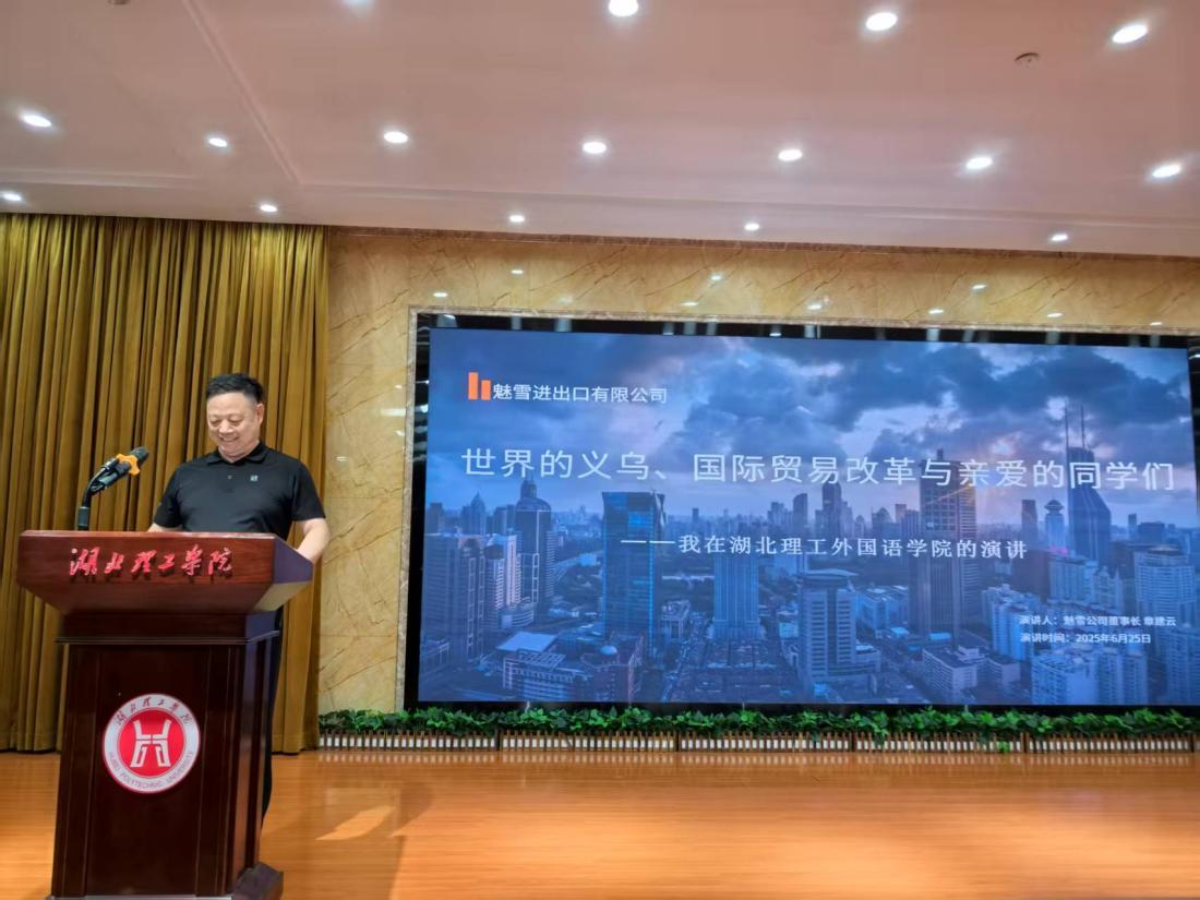 本网消息 为了帮助外语专业学生了解我国国际贸易改革和发展趋势以及未来企业对人才的需求状况,助力学生做好职业生涯规划,6月25日,william英国中文邀请义乌魅雪进出口有限公司董事长章建云做了题为“世界的义乌,国际贸易改革与亲爱的同学们”的专题讲座。讲座由学院党总支书记占赢主持,2024级全体学生参加。