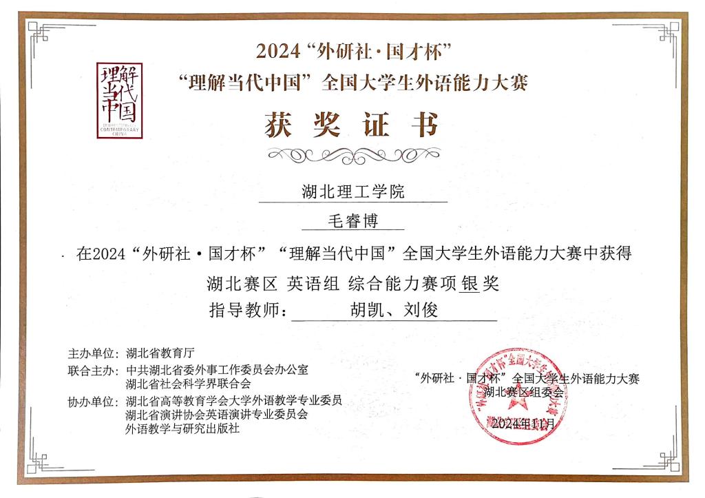 2024年“外研社·国才杯”“理解当代中国”全国大学生外语能力大赛-综合能力赛项-银奖-毛睿博