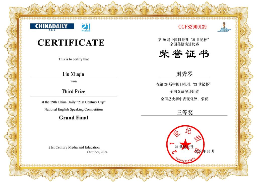 第29届中国日报社“21世纪杯”全国英语演讲比赛全国总决赛三等奖--刘秀琴