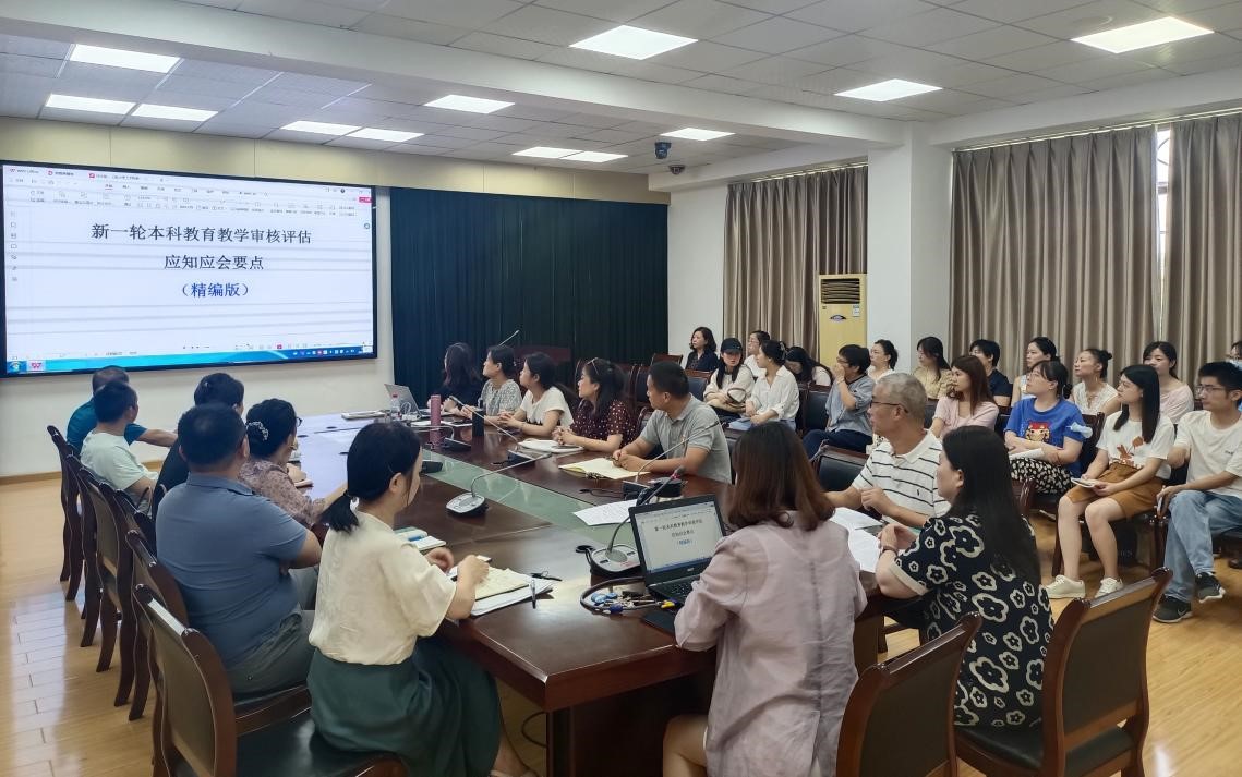 张嵋琳带领全体教职工系统学习了要点的24项核心内容,包括学校历史沿革、办学思想及理念、办学定位等,引导大家进一步熟悉我校的基本情况、重点学科、优势学科、社会声誉等。她还就“新一轮审核评估对教职工提出的要求”“教师如何做好新一轮审核评估前的准备工作?”“本科教育教学审核评估对学生、教师和专业发展有何影响?”等内容做了系统培训。